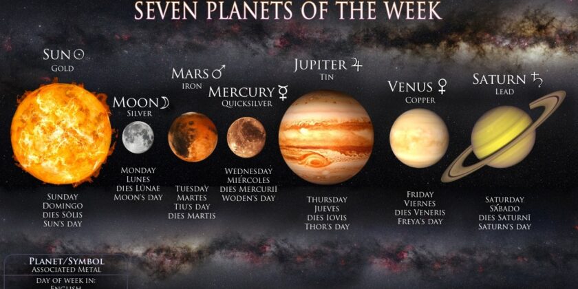 La baza denumirii fiecarei zi din saptamana se afla numele unor planete cunoscute inca din Antichitate. Folosim zilnic aceste denumiri, fara a tine cont ca fiecare zi este de fapt guvernata de catre o planeta. Astfel, ziua de Luni este guvernata de Luna, Marti de catre planeta Marte, Miercuri de Mercur, Joi de Jupiter, Vineri de catre planeta Venus, Sambata este guvernata de Saturn, iar Duminica de catre Soare.